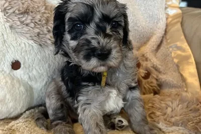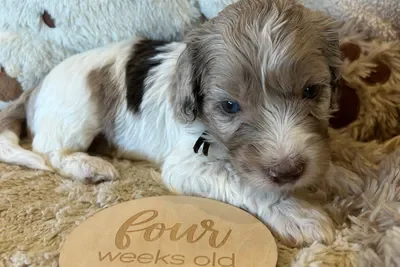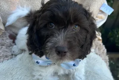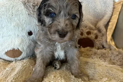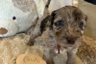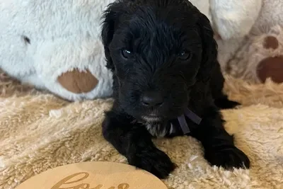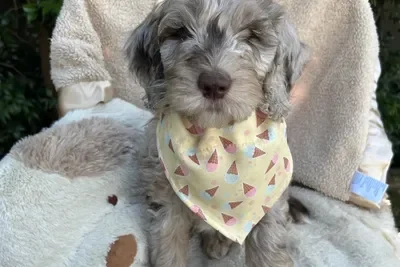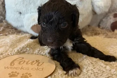 Sunny and Cino had one lucky little singleton puppy who is now known as Dutch. He was a very relaxed, happy and content little man and became a bouncy bundle of puppy excitement by the time we was 6 weeks old. He has the softest wool coat that will turn into the “poodle” ringlet curls as his adult coat comes through. He is a very smart little boy who has already mastered “sit” and only had one accident inside in his first 24 hrs in his new home.